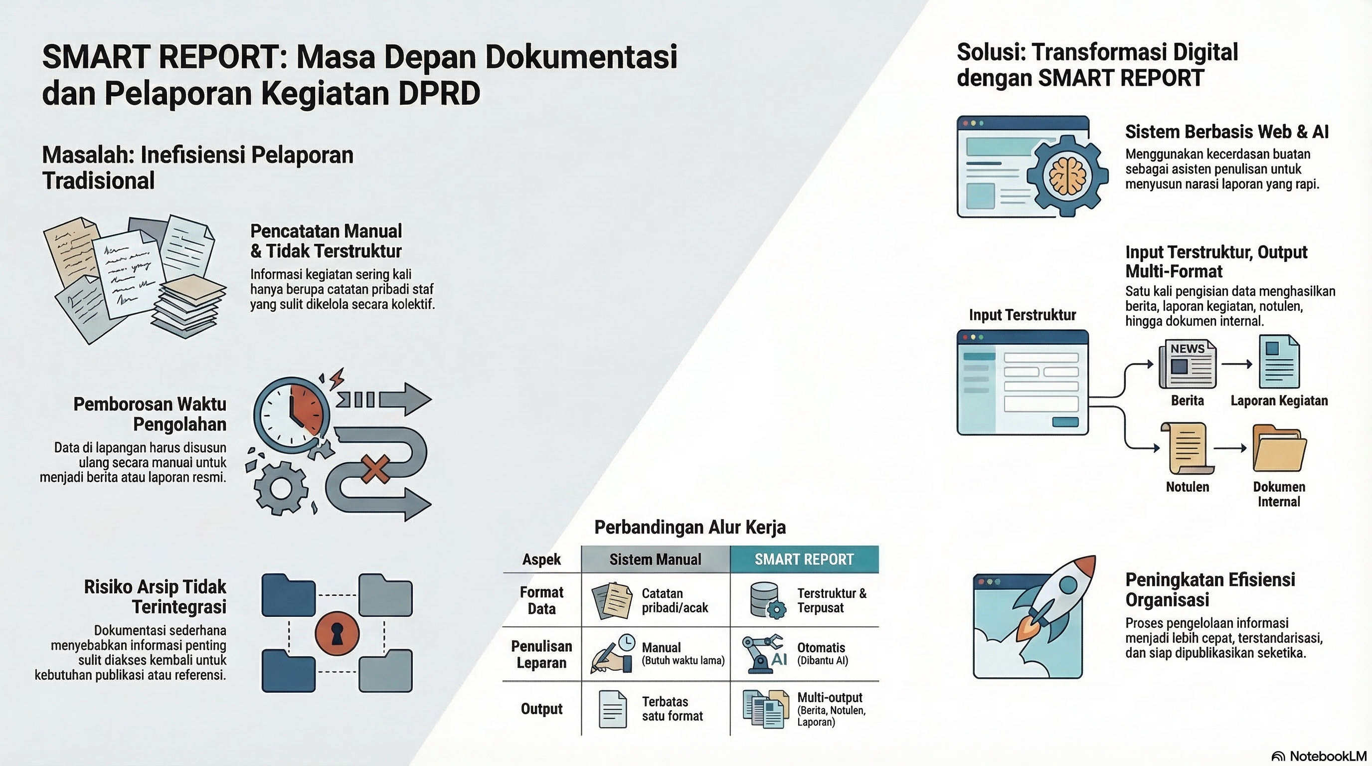 Mengapa “Smart Report” Bukan Sekadar Aplikasi Biasa Bayangkan hiruk-pikuk ditempat kerja seperti DPRD: Inspeksi Mendadak (sidak), Hearing atau dengar pendapat, debat dalam rapat, dinamika rapat komisi yang tajam, intensitas rapat dengar pendapat, hingga debu lapangan saat kunjungan kerja maupun kegiatan pengawasan lainnya. Di momen-momen krusial ini, kebijakan besar dilahirkan. Namun, sering kali terjadi “tragedi sunyi”…